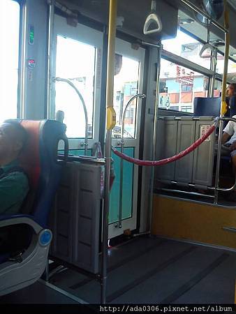 高雄的公車上為了不讓乘客站在門旁邊,加掛了兩條紅色帶子