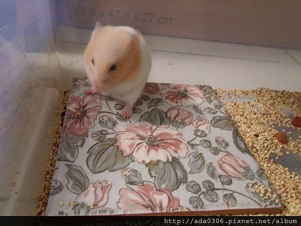 背面是不規則的波浪狀凹凸紋路,是為了容易固定在牆上,而且背面是瓷磚的原樣,所以有點粗糙,網路上有鼠友說粗糙面可以在冬天讓倉鼠磨爪,目前我還沒嘗試使用這方式,等冬天再看看。花磚重量有288公克,黃金鼠能推動,但翻不了面,比較安全,不會被花磚壓傷。
