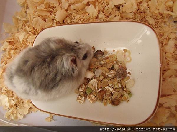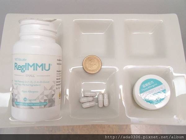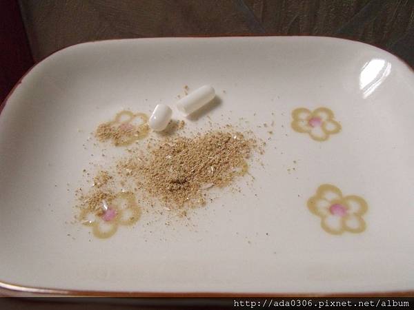五公斤以下的小寵物(貓、狗、兔、鼠等小動物)吃一顆,呼嚕是把膠囊打開酌量加入飼料中,畢竟倉鼠只有幾公克啊!像這種粉狀食品很難避免倉鼠進碗去踩,不過「半分小刀」常常舔手腳保持乾淨,也就這樣餵食了。