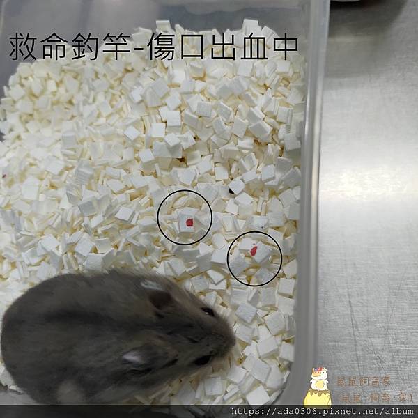 「救命釣竿」在出血,教授夾起染血的阿爾發,說這種墊材就對了,可以很清楚觀察到(被醫師們看見的第一片沾血墊材,血跡甚至細微地如圓珠筆點一點而已)。阿爾發方塊用鑷剪沿著層理撕去多餘的,留下薄面再擠壓塗抹於已滴水之玻片,鏡檢結果未有白血球,推測創口沒有化膿,但還是要開止血藥及Vit.K,並且立即抽考實習醫師們:倉鼠不能用哪些藥?聽他們說了咕嚕咕嚕三種專業名詞,我很期待未來特寵醫師越來越多喲!