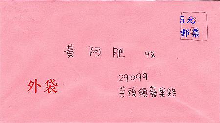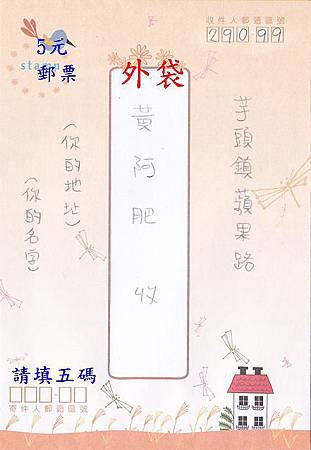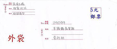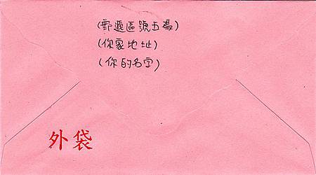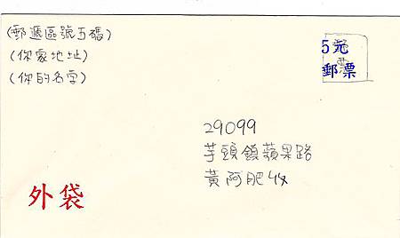 步驟一、拿第一個信封(外袋),貼上5元郵票,把贈送者給你的那個地址+郵遞區號跟姓名寫在收件人欄