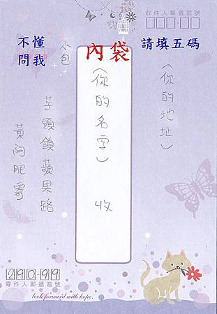 內袋沒寫呼嚕家的地址-->幫他填好。其實寄件人地址沒寫,東西還是能收到,但怕萬一中間有什麼差錯,需要退回郵件時,沒有寄件人地址的話,東西會被直接丟棄,很可惜也很浪費QQ